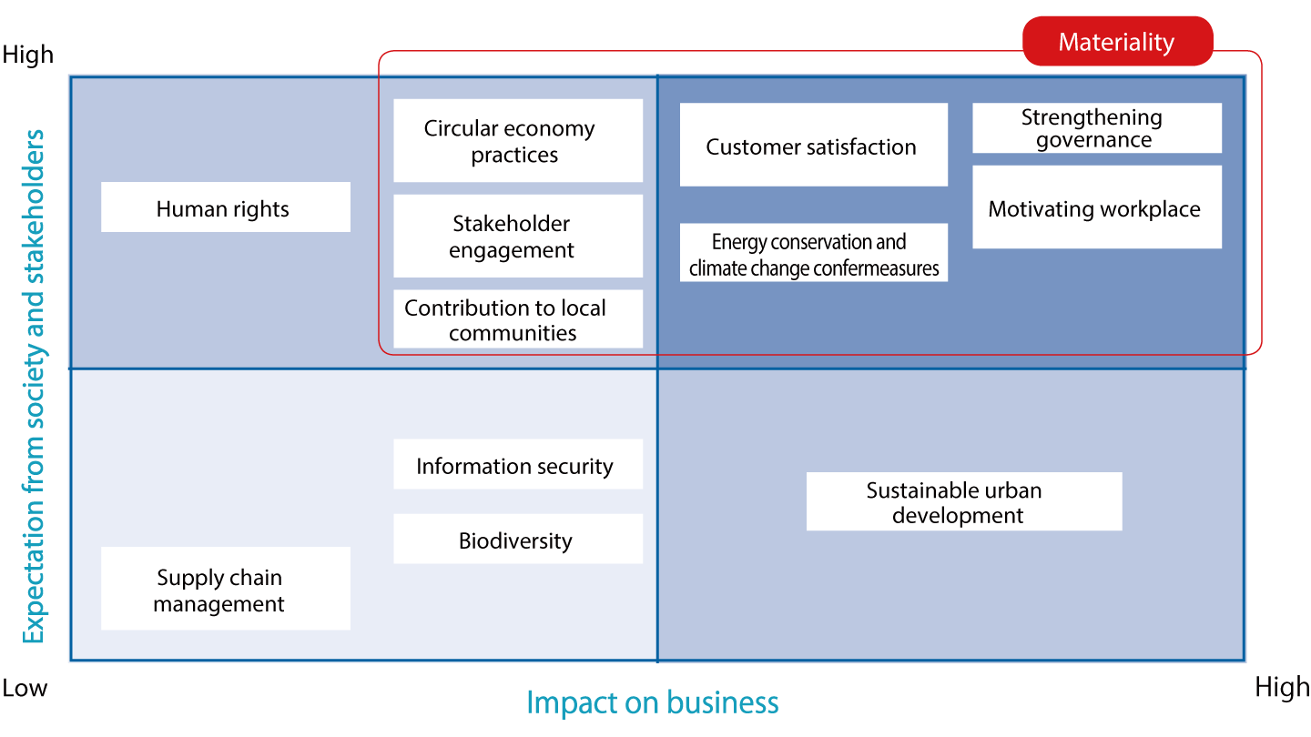 • Assess degree of impact and importance in terms of Hulic Reit’s business risks and opportunities in light of the findings of questionnaires of Hulic REIT Management’s key employees and officers and the Sustainability Policy