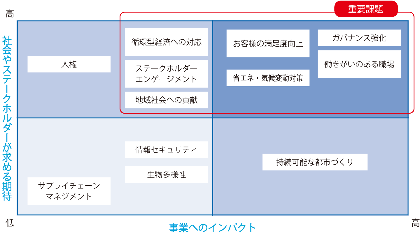 - 2つの視点からの評価結果をマトリックスで示したマテリアリティ案の作成